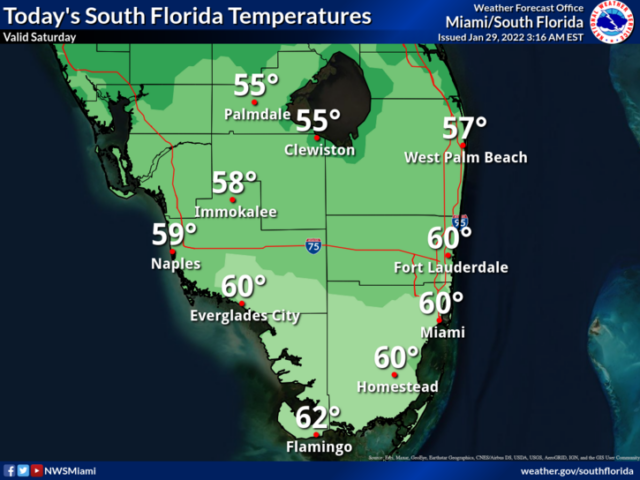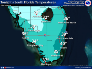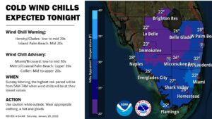 Saturday features a chilly morning, followed by lots of sun and windy conditions. A high risk of dangerous rip currents is in place at the Gulf beaches and along the Palm Beach County coast. There’s a moderate rip current risk at the Broward and Miami-Dade beaches. A freeze watch is issued for western portions of South Florida on Saturday night into Sunday morning. Highs on Saturday will be near 60 degrees in the east coast metro area and in the upper 50s along the Gulf coast and well inland.