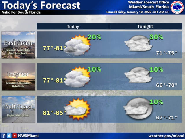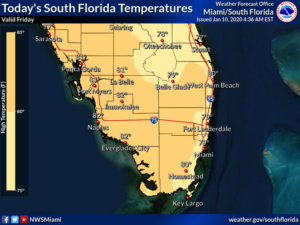 Friday features good sun and a few clouds and showers on a strong breeze along the Gulf coast, while the east coast metro area will see gusty winds off the ocean, plenty of clouds, and some passing showers. A high risk of dangerous rip currents remains in place at the Atlantic beaches through the weekend. Highs on Friday will be in the low 80s.