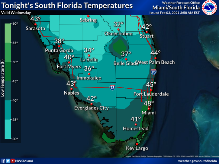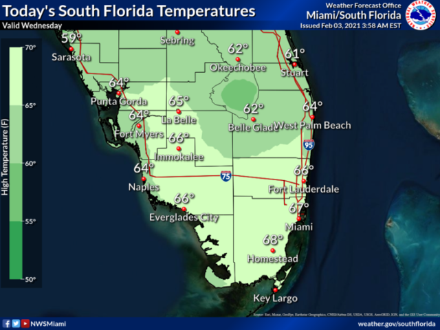 Our wintry Wednesday features sunny skies but with a chilly breeze. A moderate risk of dangerous rip currents is in place at South Florida’s beaches. Highs on Wednesday will be mostly in the mid-60s, with a few locations in southern Miami-Dade making it into the upper 60s.