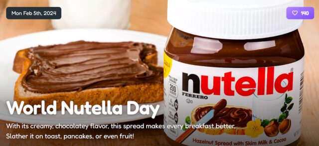 World Nutella Day celebrates what happens when hazelnuts and chocolate collide. For example, millions of people celebrate on February 5th each year! 2024 is the 60th anniversary.